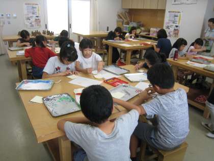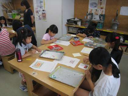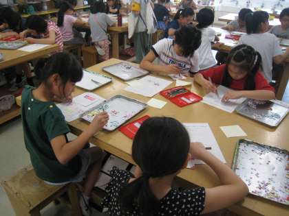 7月23日、ワークショップ事務局主催の太子堂ワークショップの様子です。「タイル風マグネット」講座、児童は思い思いの下絵を描き、楽しみながら色とりどりのタイルを組み合わせ、作品作りに励みました。