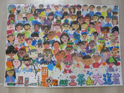 世田谷線沿線イベントのため、図工専科教員の指導のもと、2年生児童が「三茶de大道芸」をテーマにした共同制作に取り組み、かわいらしい力作が完成しました。10月頃、中吊り広告として世田谷線の車内に掲示されるので、是非ご覧ください。