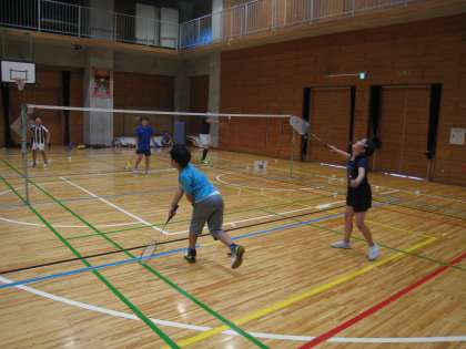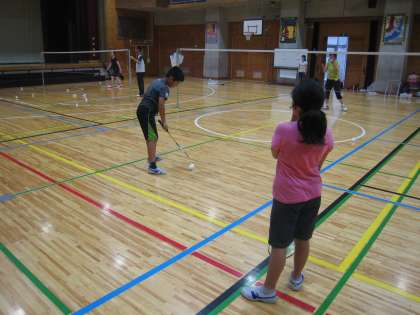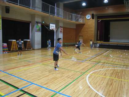 7月26日、ワークショップ事務局主催の太子堂ワークショップの様子です。「バドミントン」講座、児童は基本技術を教えていただき、暑い体育館でバドミントンを楽しみました。