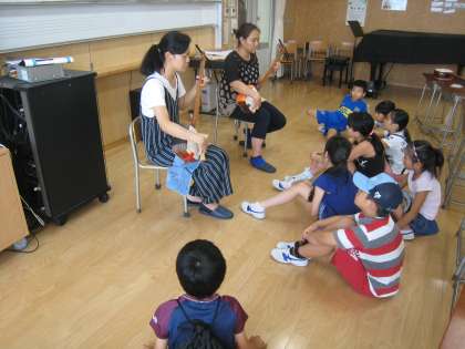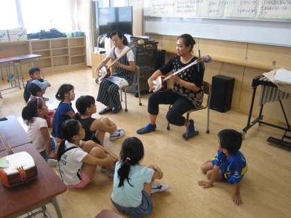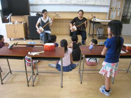 7月26日、ワークショップ事務局主催の太子堂ワークショップの様子です。「三味線」講座、児童は三味線を演奏していただき、美しい音色に聴き入り、鋭いバチさばきに見とれていました。