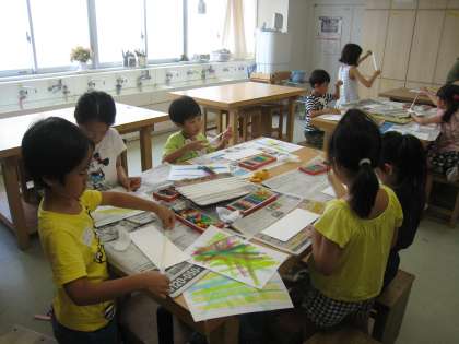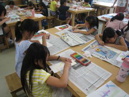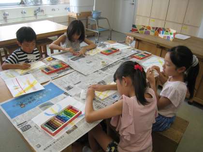 7月31日、ワークショップ事務局主催の太子堂ワークショップの様子です。「夏色コレクション」講座では、マスキングテープで画面を区切り、自分なりの夏を思い描いて、オイルパステルで塗り込みました。