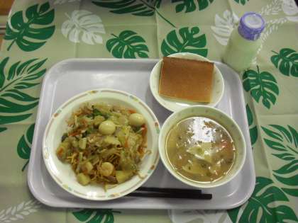 五目あんかけそばは油で揚げた中華麺に調理した肉、えび、ほたて、いか、白菜、人参などのあんをかけた栄養満点なメニューです。油で揚げ、ぱさぱさにした麺の上にあんをかけるので「堅焼きそば」「あげそば」「バリそば」と呼びます。インスタントの物で良く似ている物もありますが、日本でアレンジが加わっているので、日本の物と言われています。<保健美化給食委員会 昼の放送発表より>