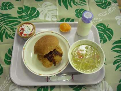 本日のメニュー『セルフフイッシュサンド・ヌードルスープ・せとか・牛乳・アイスクリーム』