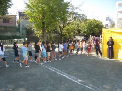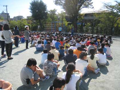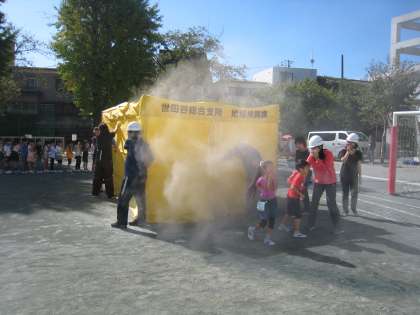 10月9日、避難訓練を実施しました。今回は世田谷区役所地域振興課の職員から火災の際の注意点を話していただき、全校児童が煙体験訓練を行いました。
