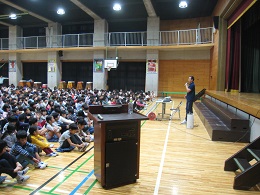 10月28日、2校時、体操競技オリンピアンの鹿島丈博さんをお招きして、全校児童対象にオリンピック・パラリンピック教育講演会を実施しました。アテネオリンピックや北京オリンピックであん馬を演技している映像を観て、児童はその素晴らしさに歓声をあげていました。講演内容は「私にとってのオリンピック」という演題で、「夢をもつことの大切さ」「達成するまで努力してあきらめないこと」「人間性を高めることの大切さ」などを全学年児童に分かりやすく話していただきました。児童は、熱心にお話を聞き、質問コーナーでは、多くの児童が質問していました。最後にアテネオリンピックの金メダルを見せていただ、会場中が大いに盛り上がりました。