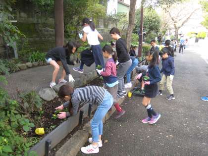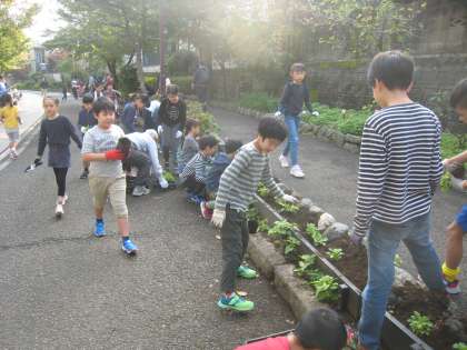 10月31日、薄日が差す中、地域の方に指導を受けながら3年生が緑道の花壇に秋の花を植えました。児童は体験を通して、毎日緑道の掃除をしていただき、環境美化に努めている地域の方へ感謝の気持ちをもつことでしょう。