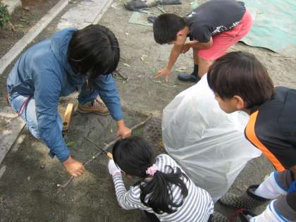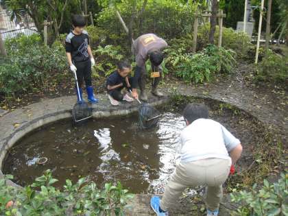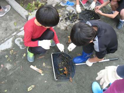 10月31日、3年生がビオトープ指導員の方たちから指導を受けながら、ビオトープに生い茂った草を刈ったり、生息している生き物を採る体験学習を行いました。児童は、人口池に自然界の循環ができていることを体験でしていました。