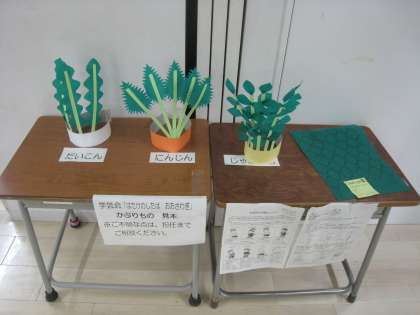 学芸会で1年生が発表する「はたけのしたはおおさわぎ」という劇で着用する小道具です。先生たちが野菜の雰囲気を出すために工夫して作りました。発表当日まで、たくさん練習しますので野菜に扮する子供たちを楽しみにして下さい!