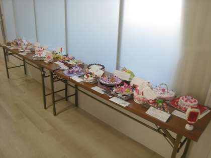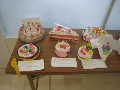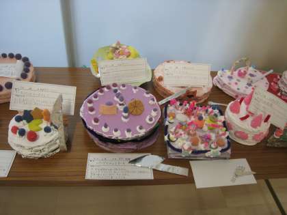 4年生が図工の授業で制作した「ケーキ」です。児童は、自分が食べたい世界でひとつだけのケーキをイメージして作りました。学校へお越しの際には、パティシエたちが創造した世界をたっぷり堪能してください。