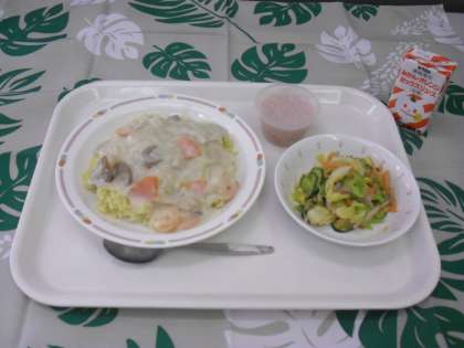 4月21日(木)のメニュー『ドリア風・イタリアンサラダ・いちごゼリー・みかんジュース』