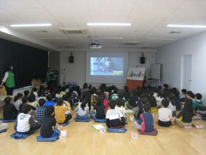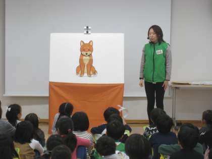 12月4日、2年生が生活科授業で、東京都動物愛護センターの職員の方から説明を受ける「動物教室」に取り組みました。犬の被り物に塗り絵をしたり、人を助ける様々な種類の犬について学びました。