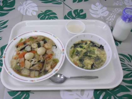 4月25日(月)本日のメニュー『中華丼・にらたまスープ・牛乳・杏仁豆腐』