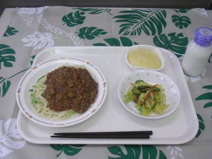 4月28日(木)のメニュー『ジャージャー麺・中華サラダ・マーラカオ・牛乳』