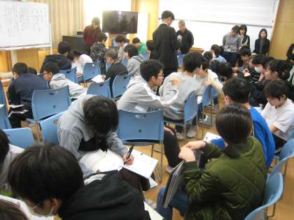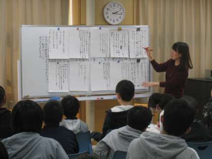 1月29日、太子堂中学校にて大志の学び舎合同研修会を行いました。本日はたまたま中学校では「カジュアルデー(私服登校)」の日でした。1年生(2クラス合同)を対象にした「特別の教科 道徳」、主題「伝統を守る『奈良筆に生きる』」を教材にした研究授業を1年担任の先生が行いました。その後、小中学校の教員が5グループに分かれて研究協議を行い、それぞれが発表し、全体協議を行いました。主体的・対話的で深い学びについての意見交換を通して学んだことを、今後の授業改善に活かしたいと思います。