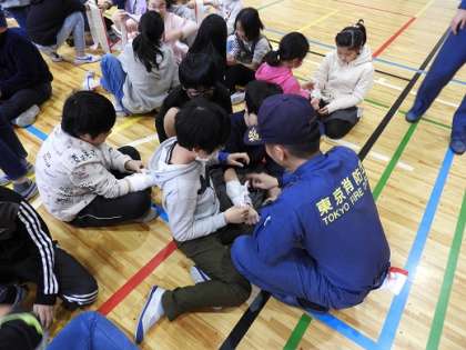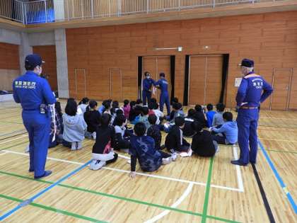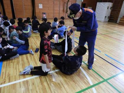 2月12日、5年生が世田谷消防署職員や太子堂5丁目消防団の方をお招きして、AEDと三角巾の講習会を行いました。不測の事態に遭遇した際、病人やけが人を介護できるように応急措置の仕方を教えていただきました。皆、真剣な表情で話を聞き、実技演習を受けていた姿が素晴らしかったです。