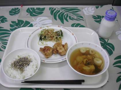 5月10日(火)本日のメニュー『ごはん・ゆかりふりかけ・鶏肉のレモンソースかけ・おひたし(青菜)・すまし汁・牛乳』です。