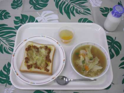 5月11日の給食『ドライカレートースト・白いんげんの田舎風スープ・フルーツゼリー・牛乳』