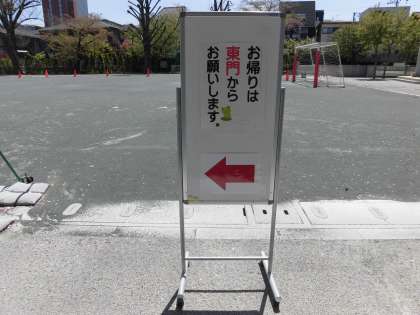 お帰りは東門からお願いします。校庭にとどまることなく、速やかにお帰りください。