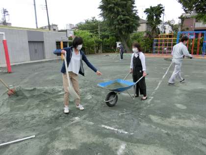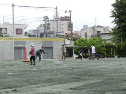 トラックが運んできたグリーンサンドを、先生たちと主事さんたちで校庭全体に広げました。固い地面がむき出しだった校庭が、砂できれいにおおわれました。