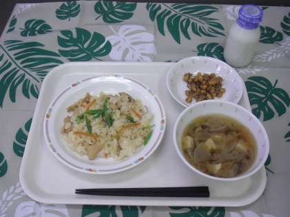 5月28日の給食『こぎつねごはん・みそ汁・大豆とじゃこの甘から揚げ・牛乳』