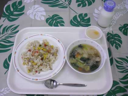5月24日のメニュー『ナシゴレン・白菜と春雨のスープ・ホワイトゼリー・牛乳』