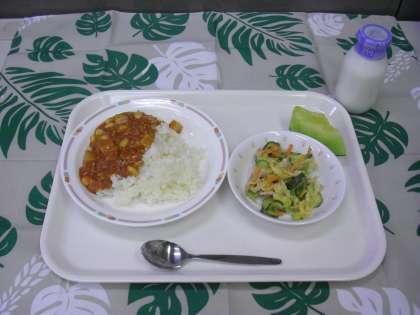 本日のチリビーンズライスはチリコンカーン(チリコンカルネ)をごはんの上にかけた料理です。チリコンカンはスペイン語で「肉入りトウガラシ」の意味ですが、アメリカのテキサス料理として有名です。1930年代の世界恐慌や肉類が配給制になった第二次世界大戦がきっかけでひき肉に豆を入れトマトでボリュームのある汁もの仕立てにしたチリコンカーンが広まったと言われています。給食では児童が食べやすいようにチリパウダーの量を少なくして大豆を入れてチリコンカーン料理としています。カレーパウダーを入れてバターで仕上げたごはんにそのチリコンカーンをかけ、チリビーンズライスの出来上がりです。(保健美化給食委員会 昼の放送発表より)