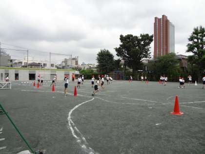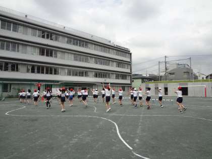 6年体育「リズムダンス・体つくり運動」では、「ハンドクラップ」の曲に合わせて軽快に踊ったり、校庭全面を使って跳んだり跳ねたり走ったりと体を存分に動かしました。体育が終わったところで雨が降り出しました。どの子も満足そうな様子でした。