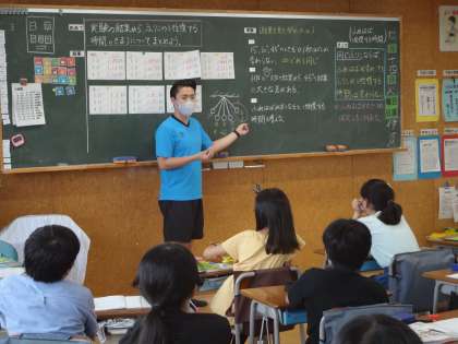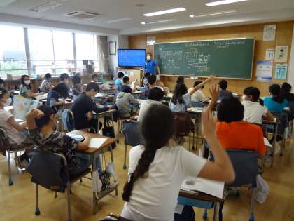 5年生は、ふりこを使った実験結果をもとに、振れ幅を変えると1往復する時間がどう変わっていくのかについて全体で話し合いをしていました。