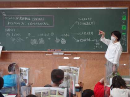 3年社会「農家の仕事」では、収穫した農作物はどのようにして私たちに届けられるのかについて、皆で考えていました。