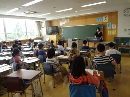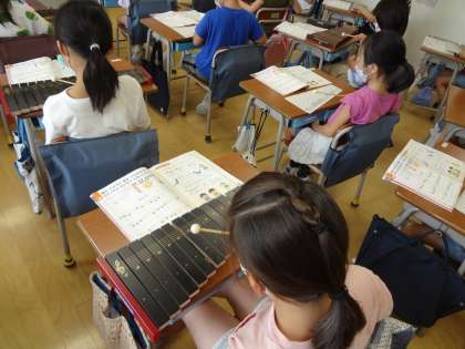 2年音楽「ドレミであそぼう」では、「かっこう」「かえるの合唱」「ぷっかりくじら」などの曲を木琴で演奏していました。本物の木琴と練習用の紙木琴とを交互に叩いていました。