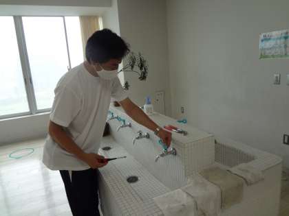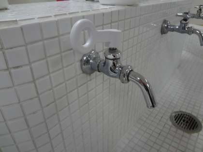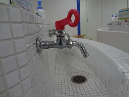 コロナウイルス対策の一つで、手を洗うために並ぶ時間の短縮し、手で触る部分を減らすために水道のハンドルを回転式のものから、左右に振るだけのスイング式に取り替えています。4階は青、3階はピンク、2階は白と決め、購入できた順に主事さんたちに付け替えてもらっています。