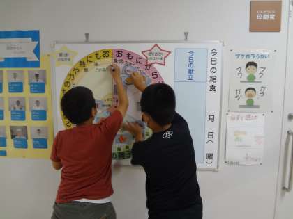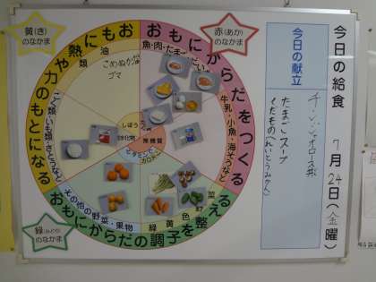 委員会活動が始まっています。給食委員会の子どもたちは、毎日、職員室の前にある給食黒板に献立を書いたり、3つの食品群に給食の食材を分けてマグネットを貼ったりしています。低学年の子どもたちも、「今日の給食何かなあ。」と言いながらよくこの黒板を見ています。