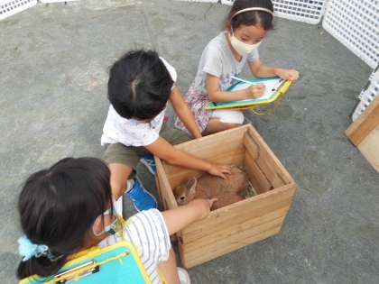2年生活科「いきものはかせになろう」では、国語「どうぶつのじゅうい」と関連を図りながら学習を進めています。今日は、校庭にサークルを出してうさぎを放してさわったり、飼育小屋の様子を観察したりしました。きなこもキャロットも体を寄せ合ったり、背伸びをしたり、かけたりして、子どもたちを喜ばせてくれました。たくさんの発見のあった1時間でした。