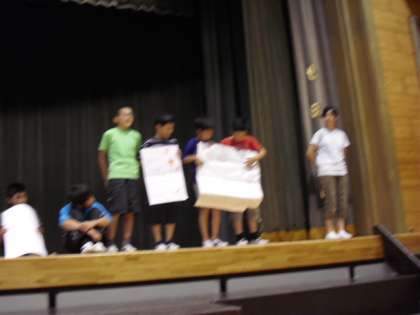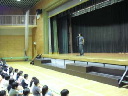 東日本大震災後、故郷の気仙沼市を見舞った教員より現地の様子やがんばっている人々の様子など大変貴重なお話がありました。(写真上)4年生の代表が「ビオトープを大切にしてほしい」などのお願いを全校児童に呼びかけました。(写真中)20日から始まる水泳学習の注意事項を運動委員会の児童がポスターや実演でわかりやすく説明してくれました。(写真下)