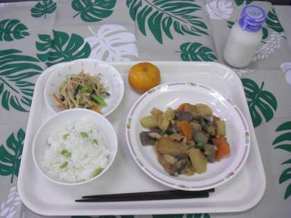 6月14日(火)のメニュー『えだ豆ごはん・筑前煮・野菜のごまだれかけ・冷凍みかん・牛乳』