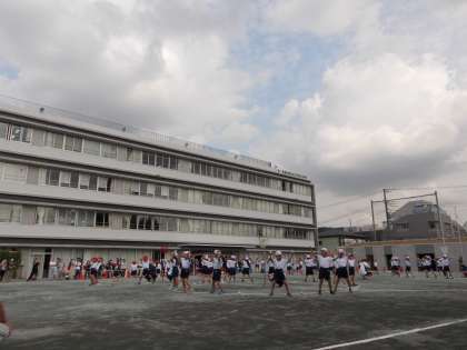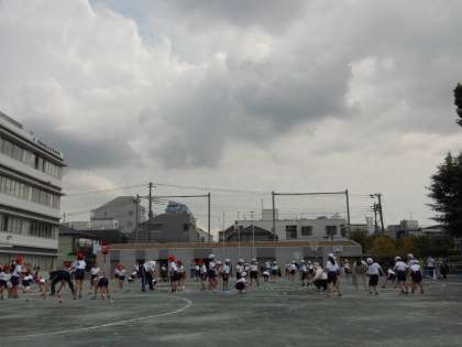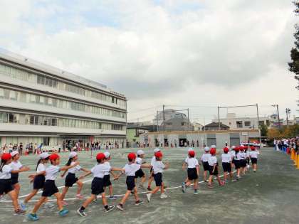 「夢をかなえて ドラえもん」に合わせてにこにこ笑顔で入場。「チャレンジダンス」「ライジングサン」を元気いっぱい踊りました。「チェッチェッコリ」の曲に合わせてダンスと玉入れをしました。1番入ったチームは22個でした。「勇気100パーセント」の曲と会場からの手拍子に合わせて退場しました。