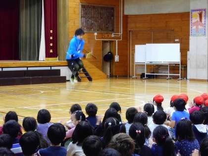 太子堂小学校は、オリンピック•パラリンピック教育アワード校です。なわとびの世界ギネス記録を11保持しているプロなわとびプレーヤー 生山ひじき先生を講師にお招きし、1〜3年のなわとび教室を実施しました。1〜3年の前で、五重とびや座ったまま、逆立ちしたまま跳ぶ技など、たくさんの技を見せていただきました。子どもたちから歓声があがりました。