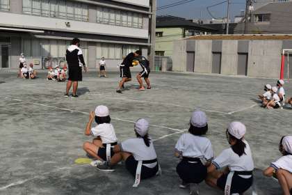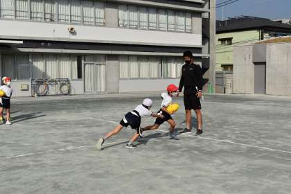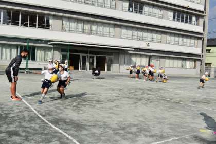 3年生は、体育で、株式会社リコー ブラックラムズ という社会人ラグビーチームの方4人にタグラグビーについてご指導をいただきました。ボールの投げ方や取り方について教えていただき、タグ取りゲームをしました。タグラグビーのボールは、回転させないように投げるのがコツだと分かりました。楽しいひとときを過ごすことができました。