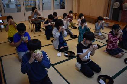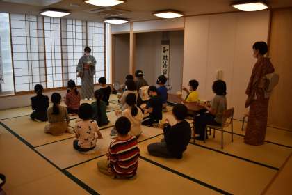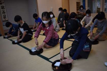 太子堂小学校では、4年生から6年生までが年1回茶道教室を実施しています。今日は、4年生がはじめての「茶道教室」を体験しました。茶道の「和敬静寂」について教えていただいた後、お茶のたて方やいただき方について練習をし、実際にお菓子を食べ、お茶をたてていただきました。お茶を飲み終わった後、よいお顔をするのもよくできました。
