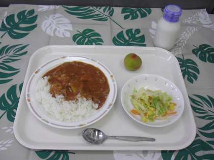 ハッシュドポークライスって何?一年生の中にはわからない人もいるでしょう。ハヤシライスと同じです。食材はカレーライスの材料と同じでカレー粉が入っていないブラウンソースです。今日のフルーツはプラムです。バラ科のサクラ属の果実です。スモモとも言われ、モモに比べて酸味があることからそう呼ばれたいます。古くから日本に伝わっており、和歌にも詠まれています。果実の旬は6月下旬から8月の中旬までです。「大石早生」「ソルダム」「サンタローザ」「メスレー」「太陽」などが代表的なプラムです。本日は大石プラムです。(保健美化給食委員会 昼の放送発表より)