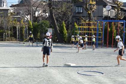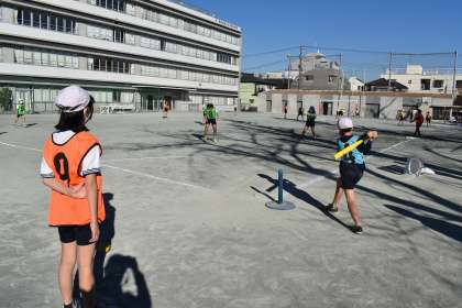 4年体育「Tボール」では、守備側と攻撃側に分かれて、新しいチームでゲームを進めていました。お互いのよいプレイを認め合う姿が見られました。
