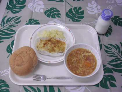 7月8日(金)の給食『セサミパン・鮭のマヨネーズ焼き・こふきいも(チーズ入り・卵スープ・牛乳』