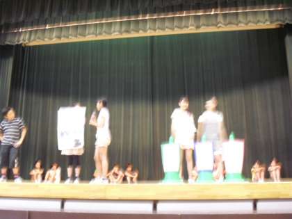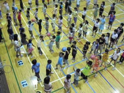 たてわり班対抗ボール送りゲームで競争(写真上)夏休みプールの諸注意のお知らせ(写真下)