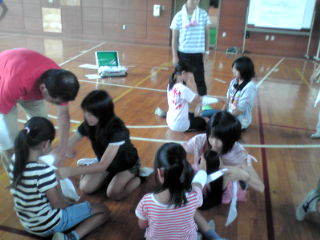 三角巾訓練。傷口に三角巾を巻き、止血する方法を教わって、実際にやってみました。