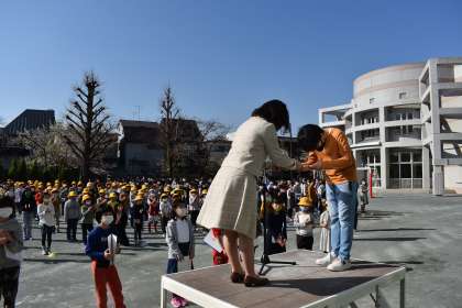 青空と満開の桜に見守られながら、修了式を実施しました。明日卒業する6年生が1番早く校庭に出て無言で並ぶ姿を下学年の児童も見習っていました。各学級の代表児童が修了証を受け取りました。そして、児童代表の言葉は、1年生と5年生。この1年を振り返り、自分の思いを伝えることができました。全校児童が一堂に会すのは、令和2年度ではじめてでしたが、最初から最後まで1年間の成長の感じられる立派な態度でした。