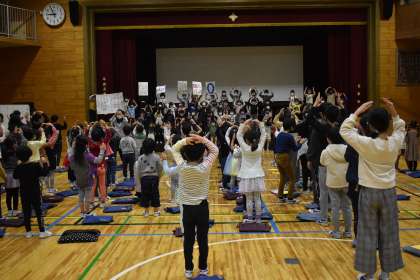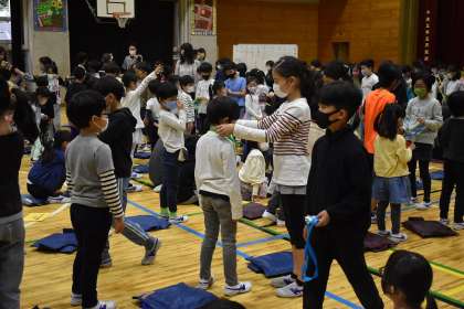 2年生は、「リズム遊び」のプレゼントです。「こいぬのビンゴ」の曲に合わせて、1年生の子どもたちは、2年生のふりを見様見真似で踊っていました。6年生も一緒に踊ってくれました。2年生、楽しい「リズム遊び」をありがとう。