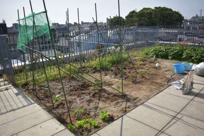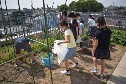 クラブ活動は、「自分の生活を楽しい豊かなものにしようとする意欲を育てる。」「自発的・自治的な集団活動をすることによって、自主性・社会性を身に付けさせる。」「実践活動を通して、想像力を養い、一人一人の個性を伸長する。」というねらいで活動を進めています。園芸クラブでは、4階の畑で、雑草抜きや土づくりをした後、ナスやキュウリ、カボチャ、スイカなど、野菜の苗を植えました。収穫が楽しみです。