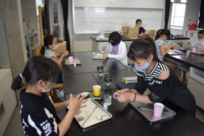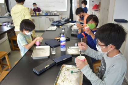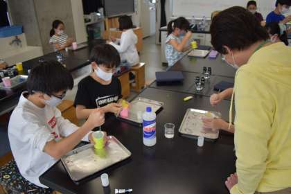 科学クラブでは、洗濯のりに色付けをしてスライムを作っていました。クニュックニュッと音を立てながら弾力性を増していくスライムを満足そうに見つめる瞳は真剣そのもの。