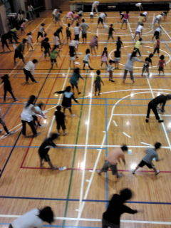 校庭がぬかるんでいるため、今朝も体育館でラジオ体操を行っています。昨日よりさらに多くの子どもたち、地域の方々が集まりました(*^-^)ノ