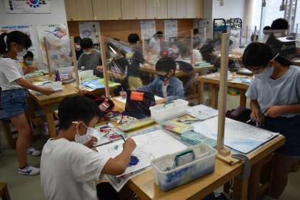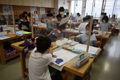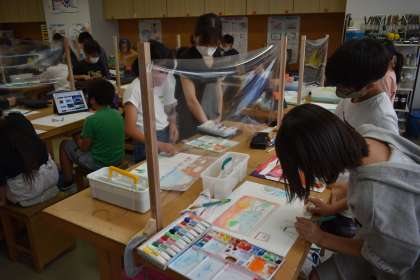 4年図工「富士七十四景」は、日本の象徴である富士山が見える景色を、構図や塗り方を工夫して表すことをめあてにしています。子どもたちは、絵の具やクレパス、色鉛筆、ブラシ、はけ、ローラー、筆などを自由に組み合わせて取り組んでいました。「何とかいい絵がかけた」と満足気に報告する子もいました。